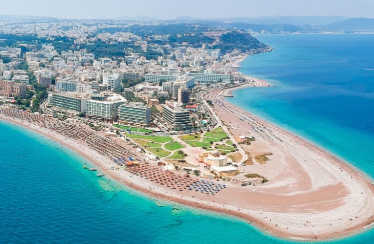 Il multi-colorati ombrelloni, le imponenti alberghi, hotel, Casino Rodos e l'Acquario di Rodi in background, tutti di loro una volta che un soggetto preferito per i fotografi, sono ora il tema del culto cartoline. Centinaia di visitatori stranieri si scende in spiaggia a Rodi Città ogni giorno, così come la gente locale godendo la loro pausa di mezzogiorno.